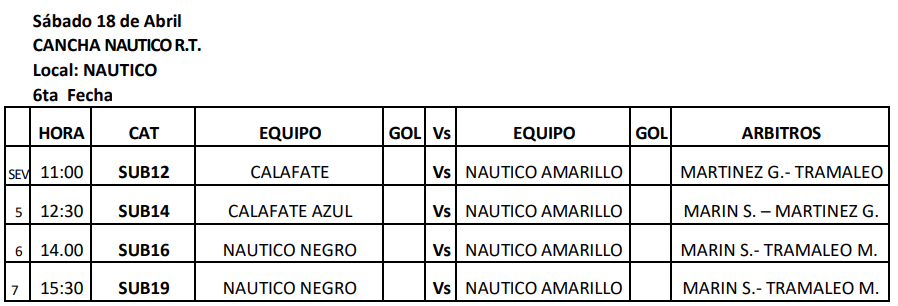 También el sábado, Náutico recibe en Rada Tilly a Calafate RC. En Sub 12 jugarán Calafate RC ante Náutico Amarillo, mientras que en Sub 14 será el turno de Calafate Azul frente a Náutico Amarillo. Además, en Sub 16 y Sub 19 juegan Náutico Negro contra Náutico Amarillo.