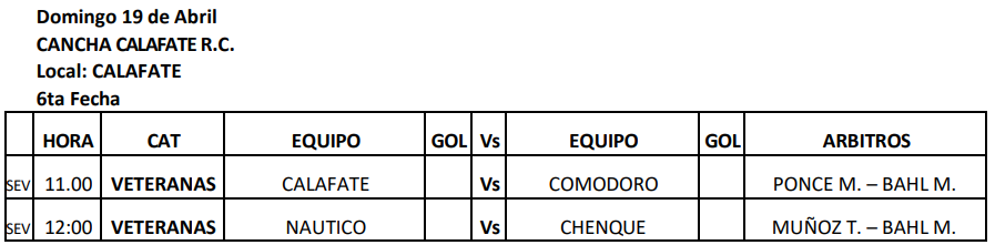 Finalmente, el domingo habrá dos partidos de Veteranas en las instalaciones de Calafate RC. El local se mide a Comodoro RC y Náutico se enfrenta a Chenque RC.