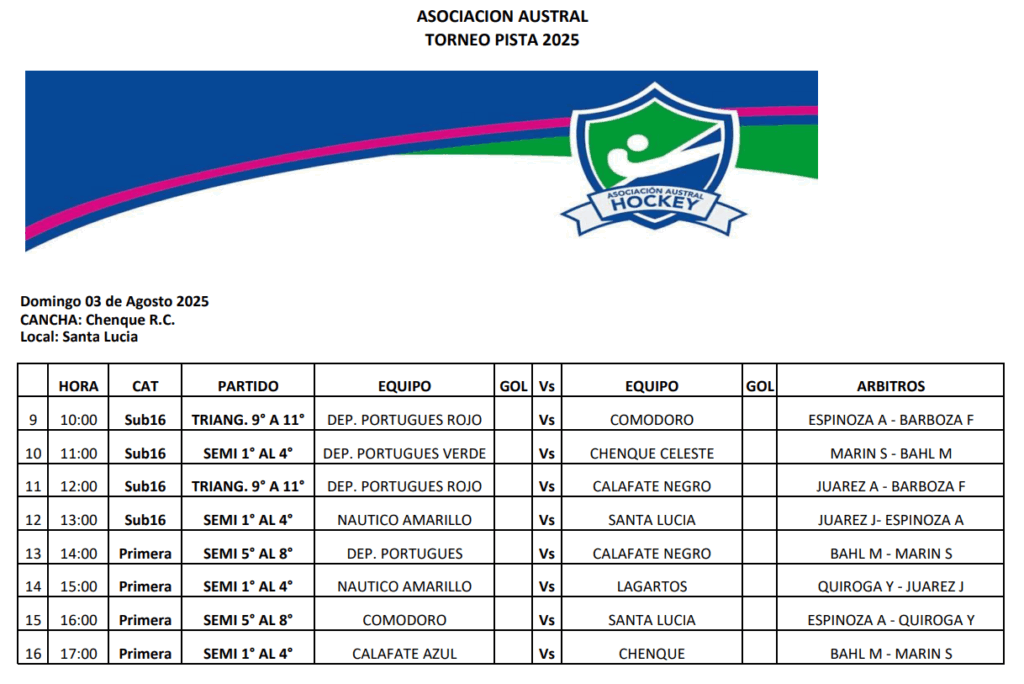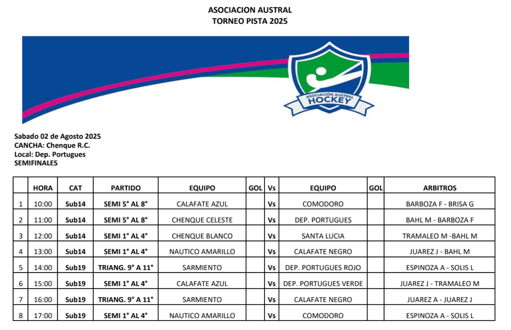 La Primera cerrará un fin de semana a puro Hockey. Deportivo Portugués vs Calafate Negro y Comodoro RC vs Santa Lucía se enfrentan en las semis del 5º al 8º, mientras que Náutico Amarillo vs Lagartos de Pico Truncado y Calafate Azul vs Chenque RC definen a los finalistas por el título.