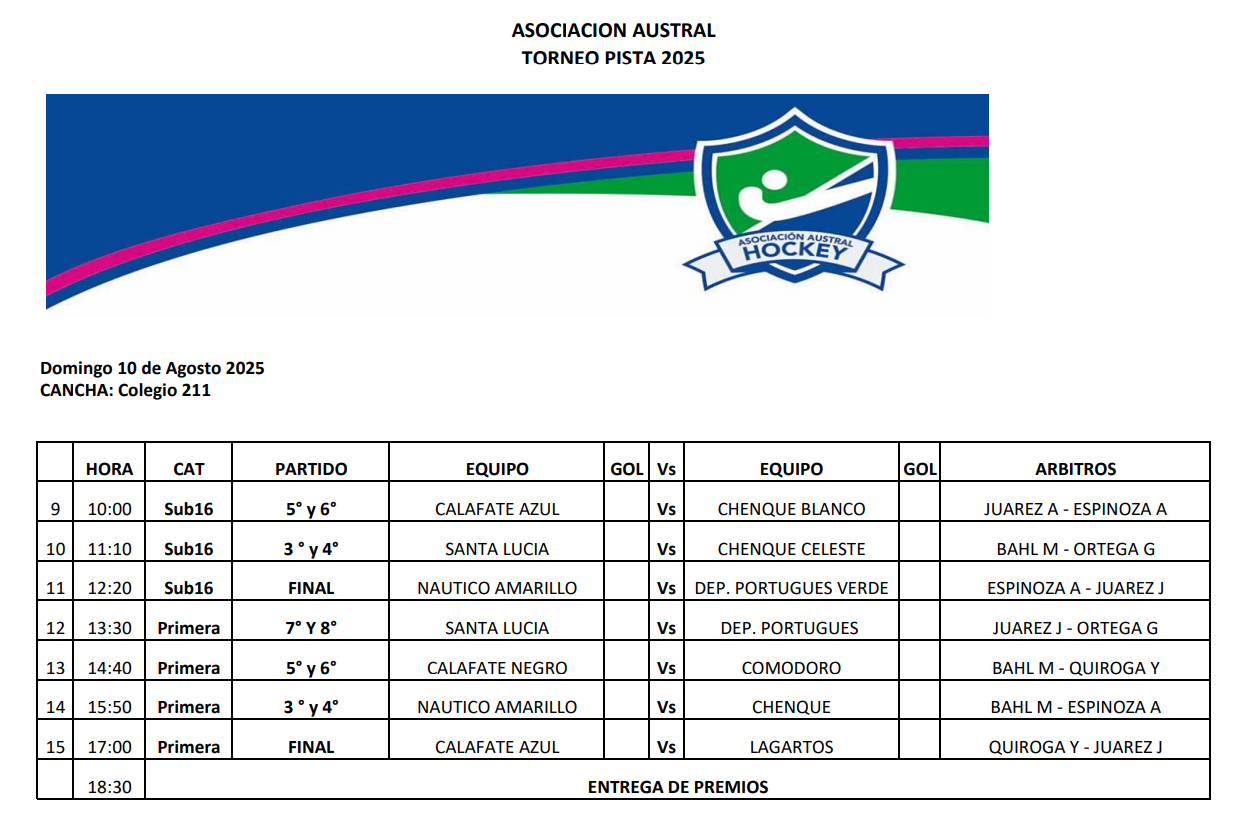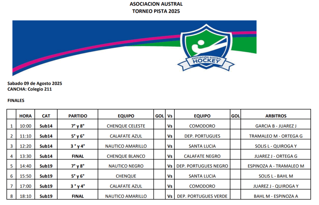 El domingo abre con las definiciones de la Sub 16. Náutico Amarillo vs Dep. Portugués Verde será la final de la categoría, mientras que Santa Lucía vs Chenque Celeste definirán el 3º y 4º puesto y el 5º y 6º será entre Calafate Azul y Chenque Blanco.