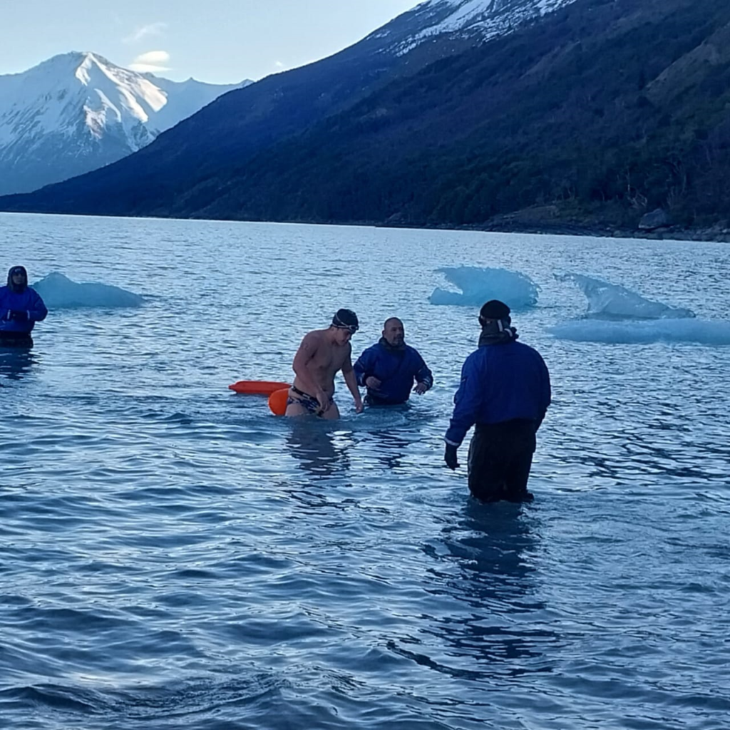En el caso de Barrios Díaz, fue el ganador en caballeros, nadando en las gélidas aguas del Lago Argentino a metros del Glaciar Perito Moreno, sin ningún tipo de protección térmica y a una temperatura del agua que rondaba entre los 2 y 4 grados centígrados.
