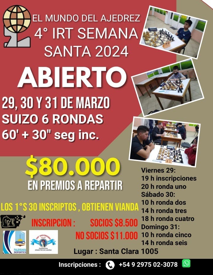 El Club Mundo del Ajedrez está organizando el IV Torneo Abierto IRT (International Rating Tournament) de Semana Santa, se llevará a cabo este fin de semana, 29, 30 y 31 de marzo, donde todos los jugadores locales y foráneos están invitados a participar.