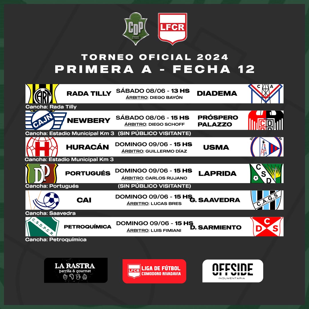 La Liga de Fútbol de Comodoro Rivadavia ya confirmó la forma en que se jugará la duodécima fecha de la máxima categoría de nuestro fútbol local, con dos partidos para el sábado y el resto para la jornada dominguera.