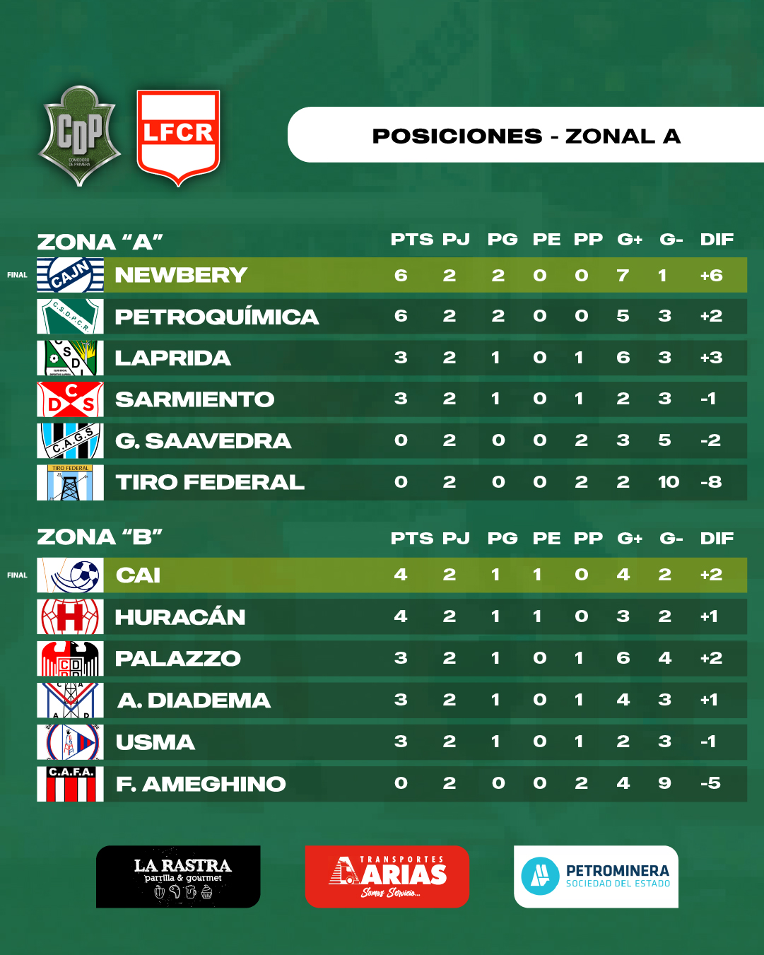 Ayer por la tarde se había dado comienzo a la fecha con la goleada de Palazzo a Ameghino. Culminada la segunda fecha, así quedó la clasificación de ambas zonas: