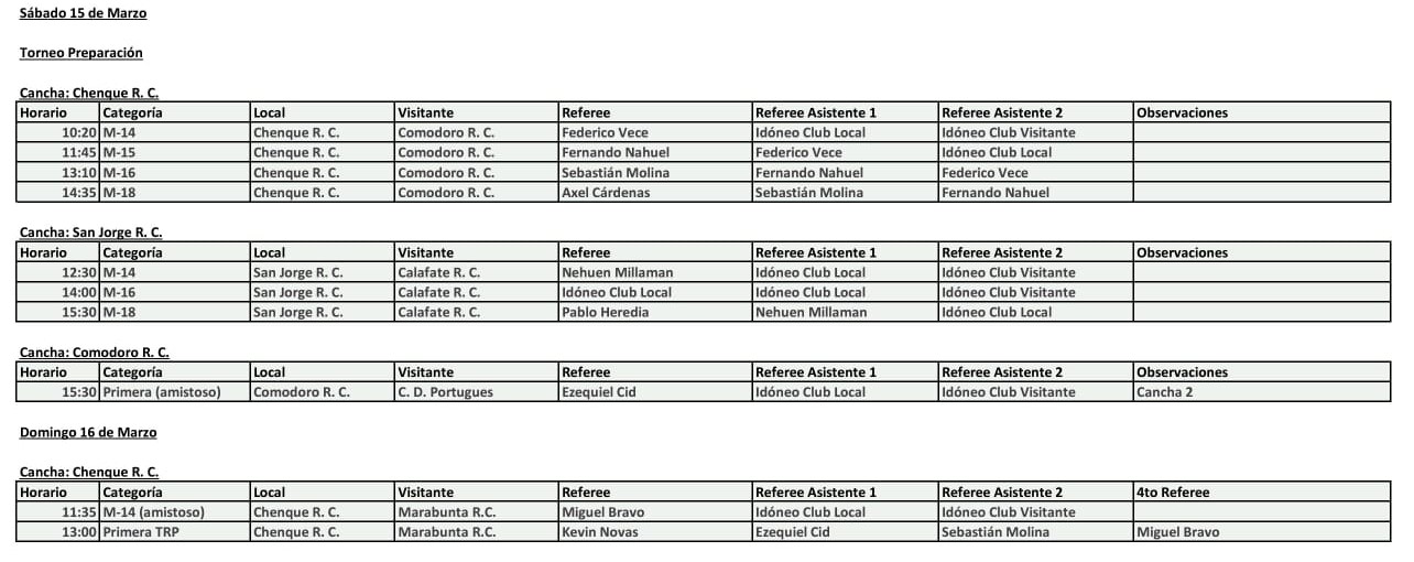 Con vistas al inicio del Torneo Oficial, que comenzará en abril, este sábado Comodoro RC, Dep. Portugues, Calafate RC y Chenque RC disputarán partidos para seguir con la puesta a punto. Chenque recibirá a Comodoro RC en las categorías M-14, M-15, M-16 y M-18, mientras que Calafate viajará a Caleta Olivia para visitar a San Jorge RC en M-14, M-16 y M-18, Dep. Portugues tendrá fecha libre.