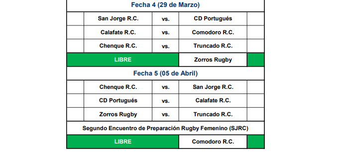 Zona A: Deportivo Portugués, Comodoro RC y Calafate RC de Comodoro Rivadavia, y Chenque RC de El Calafate.