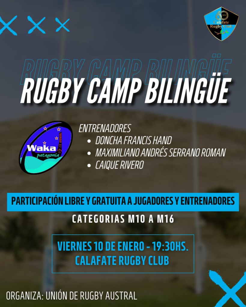 Este viernes 10 de enero, se llevará a cabo una jornada especial de Rugby Camp Bilingüe en las instalaciones del Calafate RC. La actividad, organizada por Waka Patagonia Escuela de Rugby, comenzará a las 19:30 horas, donde está destinada a jugadores y entrenadores de categorías M10 a M16.