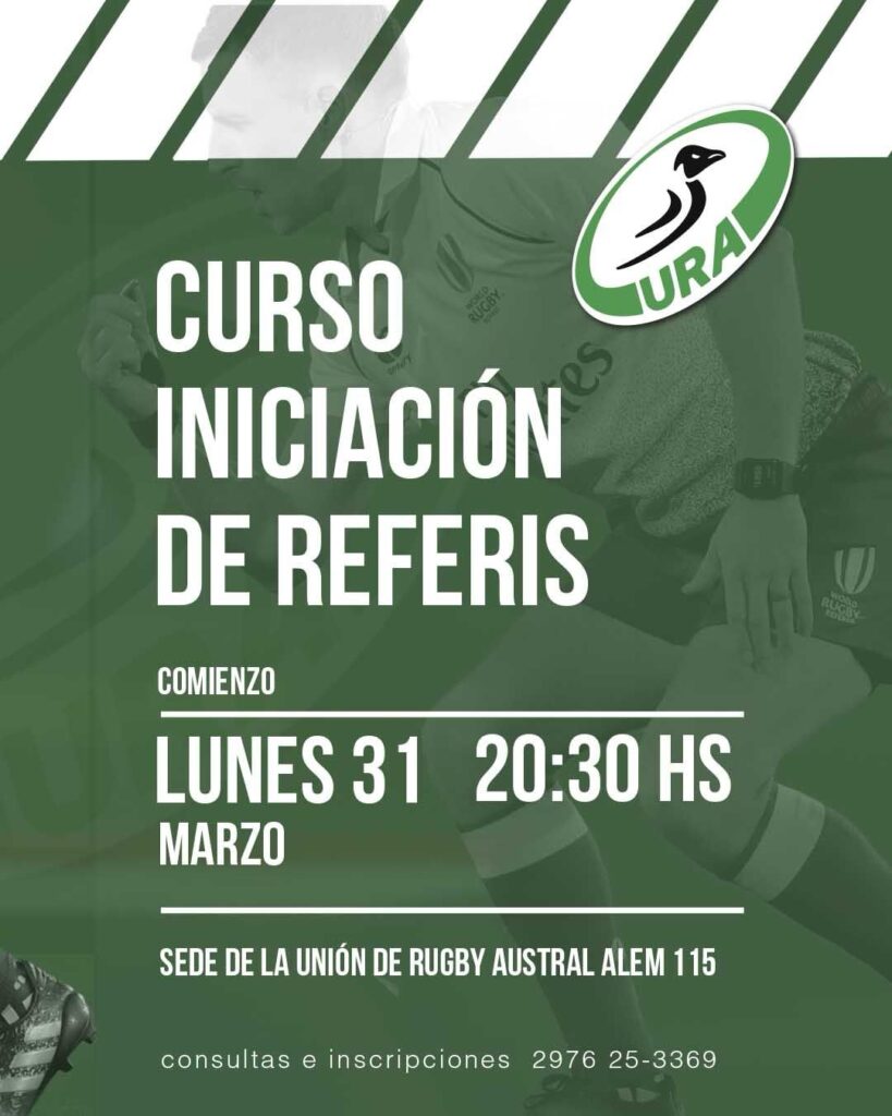 Asimismo, hoy, a las 20:30, se dará comienzo a un curso de iniciación de referís de rugby dictado por la Unión de Rugby Austral (URA), en su sede de Alem 115. El mismo se extenderá hasta el 12 de abril.