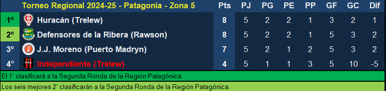 Defensores de la Ribera juega ante JJ Moreno en Puerto Madryn, el equipo de Rawson comparte el primer puesto con Huracán de Trelew con 8 puntos y tendrá una parada brava como visitante contra el Naranja que también quiere clasificarse, es que hay tan sólo UN PUNTO de diferencia con su rival y Huracán de Trelew, que juega ante Independiente que ya quedó eliminado. Una definición apasionante para esta Zona 5.