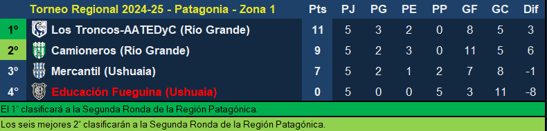 Camioneros de Río Grande tendrá que visitar a Educación Fueguina de Ushuaia, este equipo es el último de la tabla de esta Zona 1 por lo que una victoria o un empate lo mete al equipo de Camioneros en la siguiente instancia.