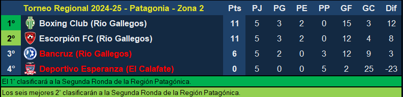 El primero en la tabla de segundos es Escorpión FC de Río Gallegos que tiene 11 puntos y jugará contra el último de su grupo, es decir, el Deportivo Esperanza de El Calafate, que perdió todos los encuentros que jugó. Boxing, por su parte, jugará ante Bancruz por esta última fecha pero a fin de cuentas, ambos equipos ya se aseguran su lugar en la próxima instancia.