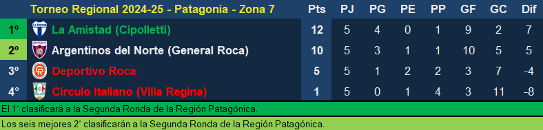 Seguimos con Argentinos del Norte de General Roca, que tiene 10 unidades y disputará su partido como local contra la Amistad de Cipolletti, el puntero del grupo con 12 puntos.