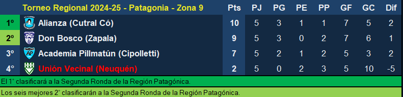 Don Bosco de Zapala hace de local para recibir al último de la tabla, Unión Vecinal de Neuquén. En la previa, tiene todas las de ganar el equipo de Zapala que tiene 9 puntos, uno de diferencia con Alianza de Cutral Có que es el líder con 10 unidades y jugará con Academia Pillmatún de Cipolletti.