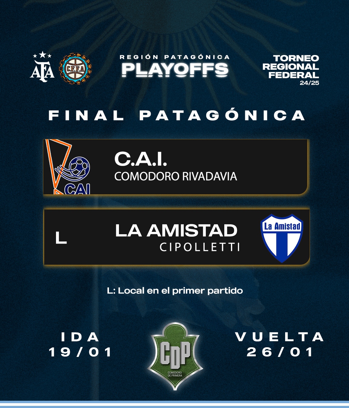 El partido de ida se jugará el próximo domingo 19 de enero en Cipolletti, donde el Azzurro debe conseguir un resultado favorable de cara a la revancha, que será en Comodoro. Tendrá lugar en el Estadio Municipal de Comodoro Rivadavia el 26 de enero donde allí se definirá al equipo que dispute la Gran Final por el Ascenso, buscando un lugar en el Torneo Federal «A» 2025.